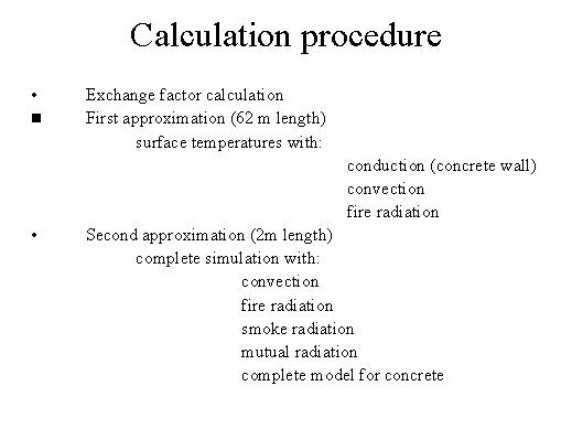 applied two step calculation procedure. First we have calculated the exchange of factor calculation, then we have taken a half of the tunnel, which is a tunnel of 62 meter length, where we obtained the surface temperature taken into account, conduction in the concrete wall, convection and fire radiation. And with these temperatures we could obtain a second step to the refined calculation where we consider a section of the concrete wall and the complete simulation with convection, fire radiation, smoke radiation, mutual radiation, which we can do now, because we had the surface temperature and the complete model for concrete. |