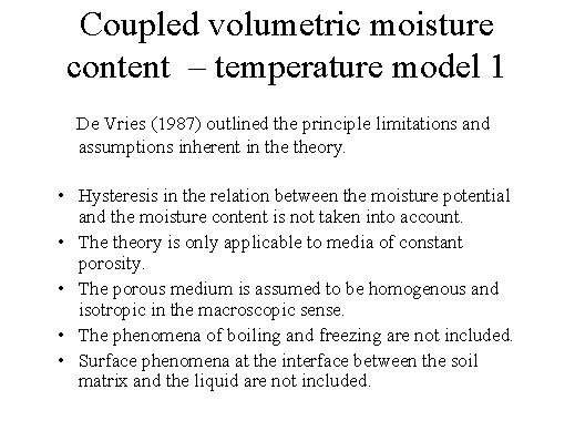 So the hysteresis in the relation between the moisture potential and the moisture content is not taken into account. The theory is applicable to medium constant porosity and the porous media is assumed to be homogeneous and isotropic and that will make it slightly simplified the hydraulic conductivity particularly. And then we ignore boiling and freezing and of course the interface is ignored. |