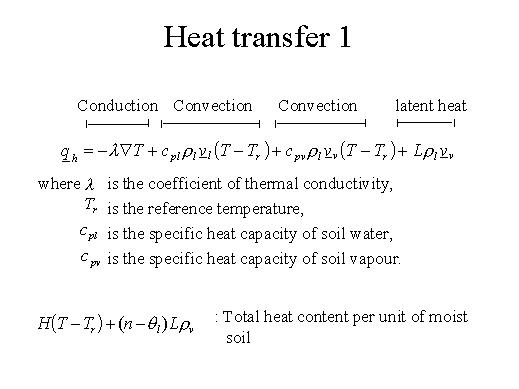 For heat transfer we have the heat flux which is qh. We have the conduction and convection terms, and then we also have total heat content per unit of moist soil, which is given by this expression.