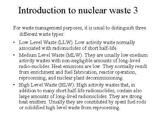| So far waste management purpose is useful to distinguish 3 types of waste. First is low activity waste, which has got a very short life of these radionucleids. Then you have a medium level waste, which are in between, and then you have high level waste, where you have very few short life radionucleids. But then there is a large amount of long living radionucleids, which causes lots of problems. And there are very strong heat emitters and therefore needs a particular attention and the research community have spent lot of time in trying to analyse this problem. |