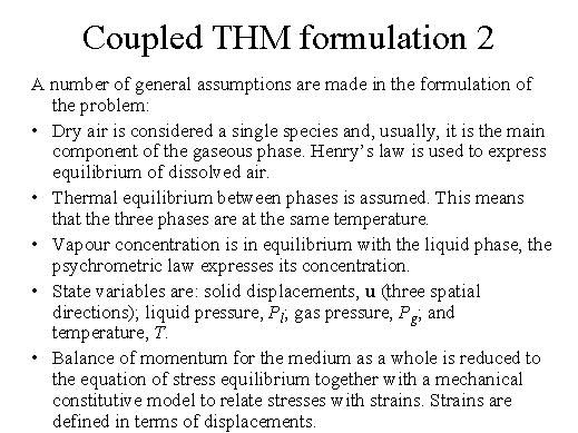 assumptions we are making. We assume that the dry air is of single species, and then we will use the Henry's law for equilibrium of this dissolved air. Then we assume thermal equilibrium between phases, which means that the three phases are at the same temperature. They are in equilibrium. Then the vapour concentration is again in equilibrium with the liquid phase. And we will use the psychometric law to express its concentration. The state variables are: solid displacement, liquid pressure, gas pressure and temperature. The balance of momentum as a whole is reduced to the equation of stress equilibrium together with a mechanical constitutive model to relate stresses with strains. |