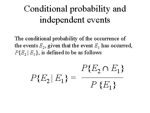 | Consider two events in the sample space E1 and E2, where E1 represents the event that has occurred, and E2 represents the event whose occurrence or non-occurrence is of interest. Furthermore, assume that P{E2} > 0. The conditional probability of the occurence of the events E2, given that the event E1 has occurred, P{E2 | E1}, is defined to be as follows. |