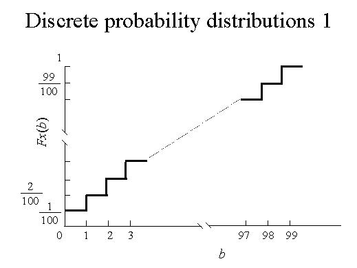 Consider the discrete random variable that represents the demand for a product in a given month. Let N = 99. If it is assumed that Px(k) = P{X = k } = 1/100 for all k = 0, 1, , 99, then the cumulative distribution function for this discrete random variable is given here. |
