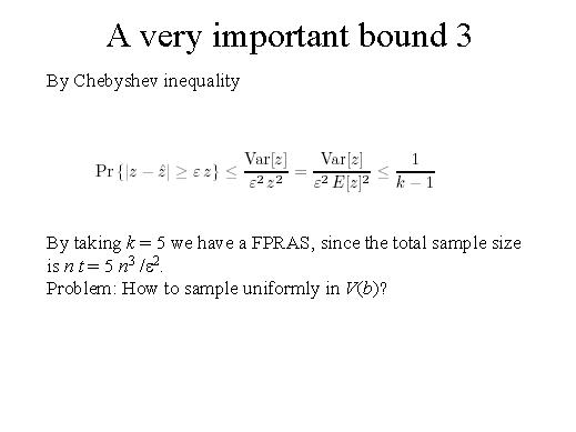 By Chebyshev inequality By taking k = 5 we have a FPRAS, since the total sample size is n t = 5 n3 /e2. Problem: How to sample uniformly in V(b)?