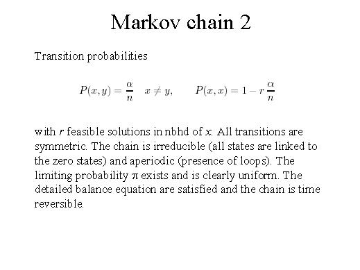 The Transition probabilities with r feasible solutions in nbhd of x. All transitions are symmetric. The chain is irreducible (all states are linked to the zero states) and aperiodic (presence of loops). The limiting probability p exists and is clearly uniform. The detailed balance equation are satisfied and the chain is time reversible. |