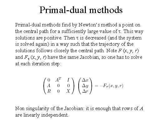 iteration step: Non singularity of the Jacobian: it is enough that rows of A are linearly independent. More critical the non singularity of the Jacobian in the optima (otherwise the method is not superlinear): unique and non degenerate optima guarantee non singularity. Non unique optima have a singular Jacobian, however the method does not converge to vertices but to strictly convex combinations of optimal vertices. Global convergence is assured by careful choice of t and the initial solution. |